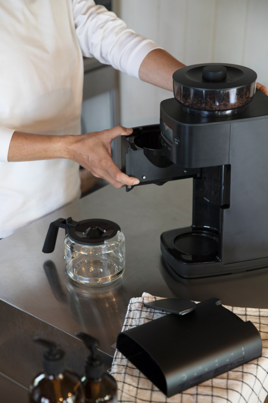 产品外观设计风格简约时尚,使用黑白两种配色,适合放置在厨房台面或餐边柜。顶部储豆盒为透明材质,豆量一目了然。